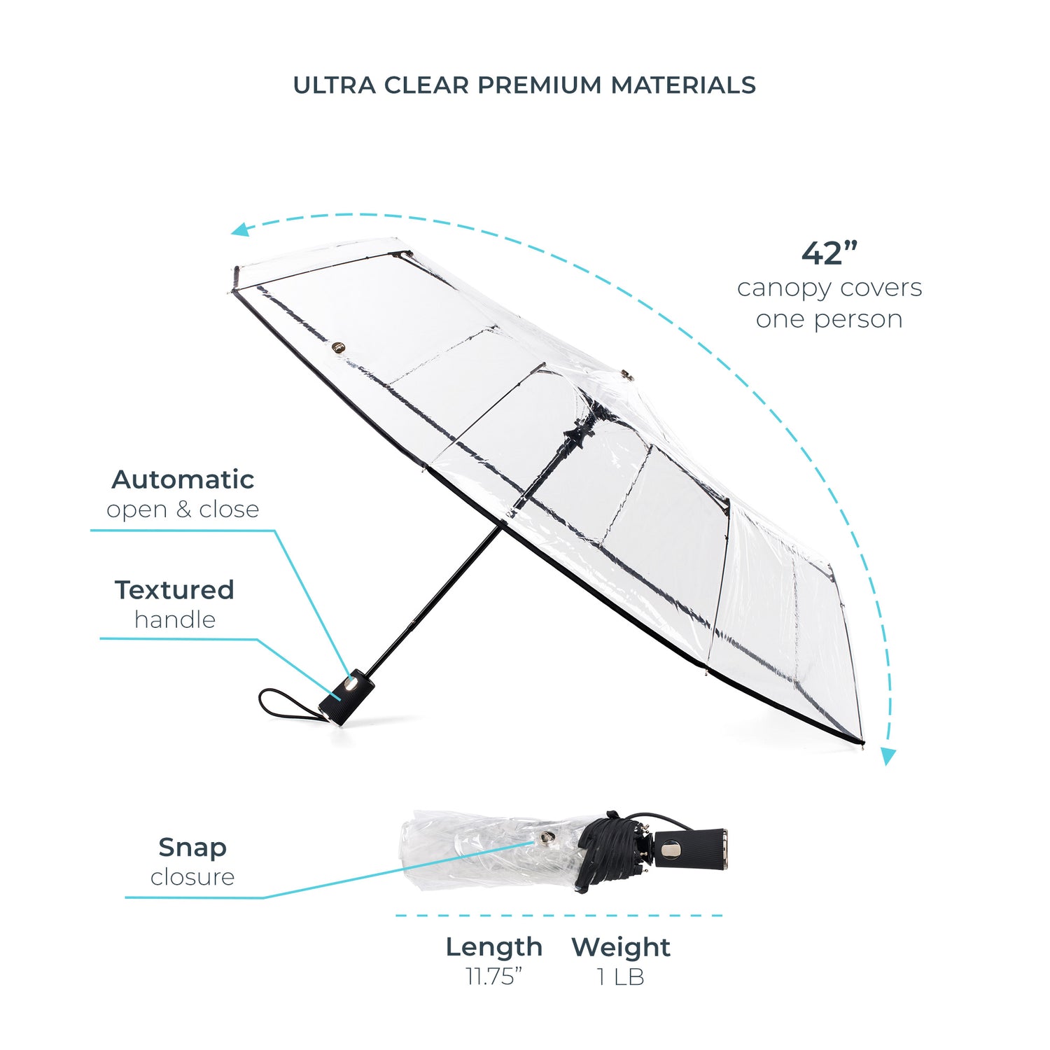 This 42-inch ultra-clear canopy gives a unique spin to the traditional umbrella, combining standout style with full coverage. The totally see-through design keeps you protected from wind and rain while letting your personality shine through.