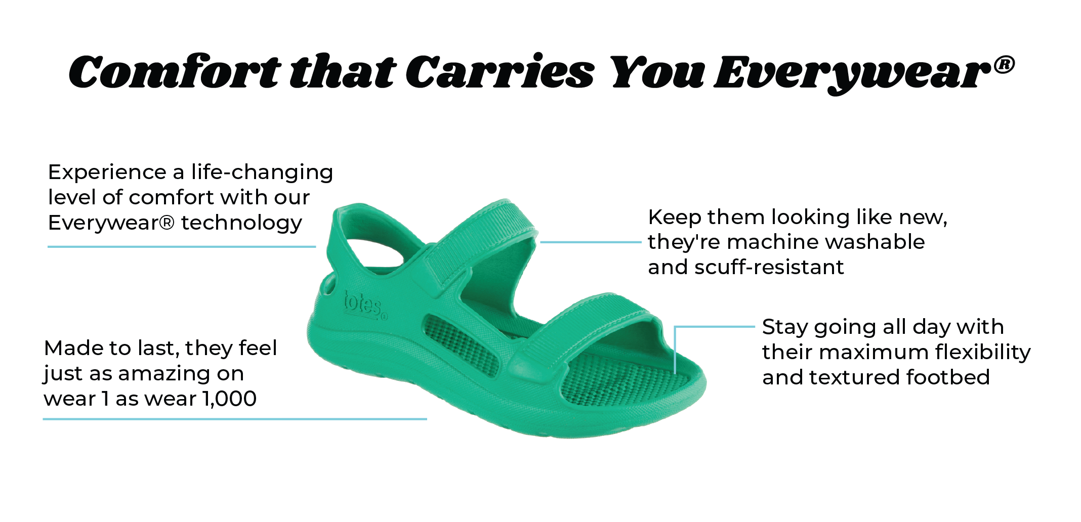 From beach days and backyard adventures to pool parties and playgrounds, these waterproof, go-anywhere sandals are made to keep up with all your wild ideas. They’re super light, tough enough for rough play, and built with special Everywear® soles that last and last—even if they don’t stop moving.