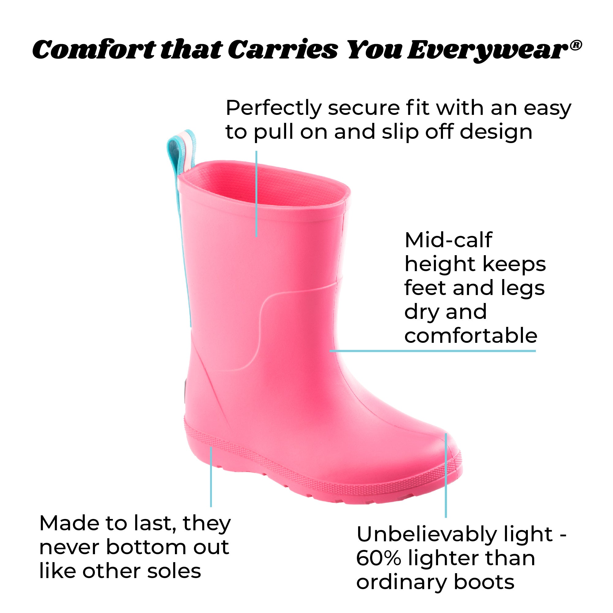 Let your little adventurer take on every splash and storm with the Charley Rain Boot. Built with revolutionary Everywear® technology, these pull-on, mid-calf boots are 60% lighter than regular rain boots—making them perfect for all-day play. Fully waterproof and tough as they come, they’re made to handle puddles, mud, and messy sidewalks with ease.