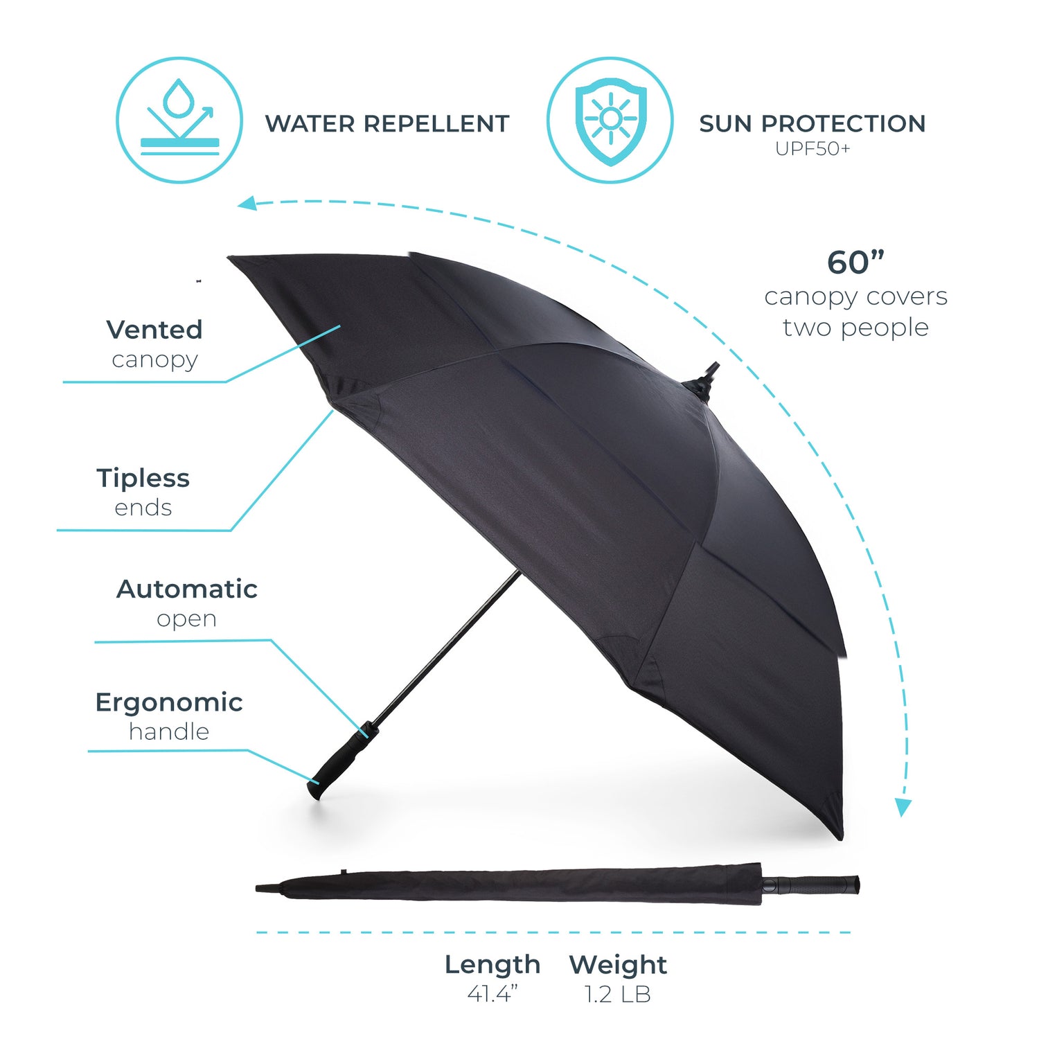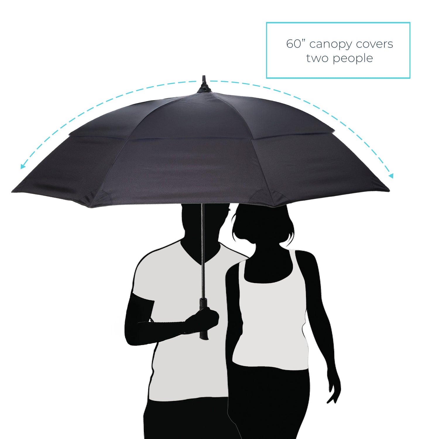 Whether you're cheering from the sidelines or walking the course, this is the umbrella that stands above the rest. With an impressive 60" arc, it comfortably shelters two adults beneath a sleek, Vented Canopy engineered for superior wind resistance.