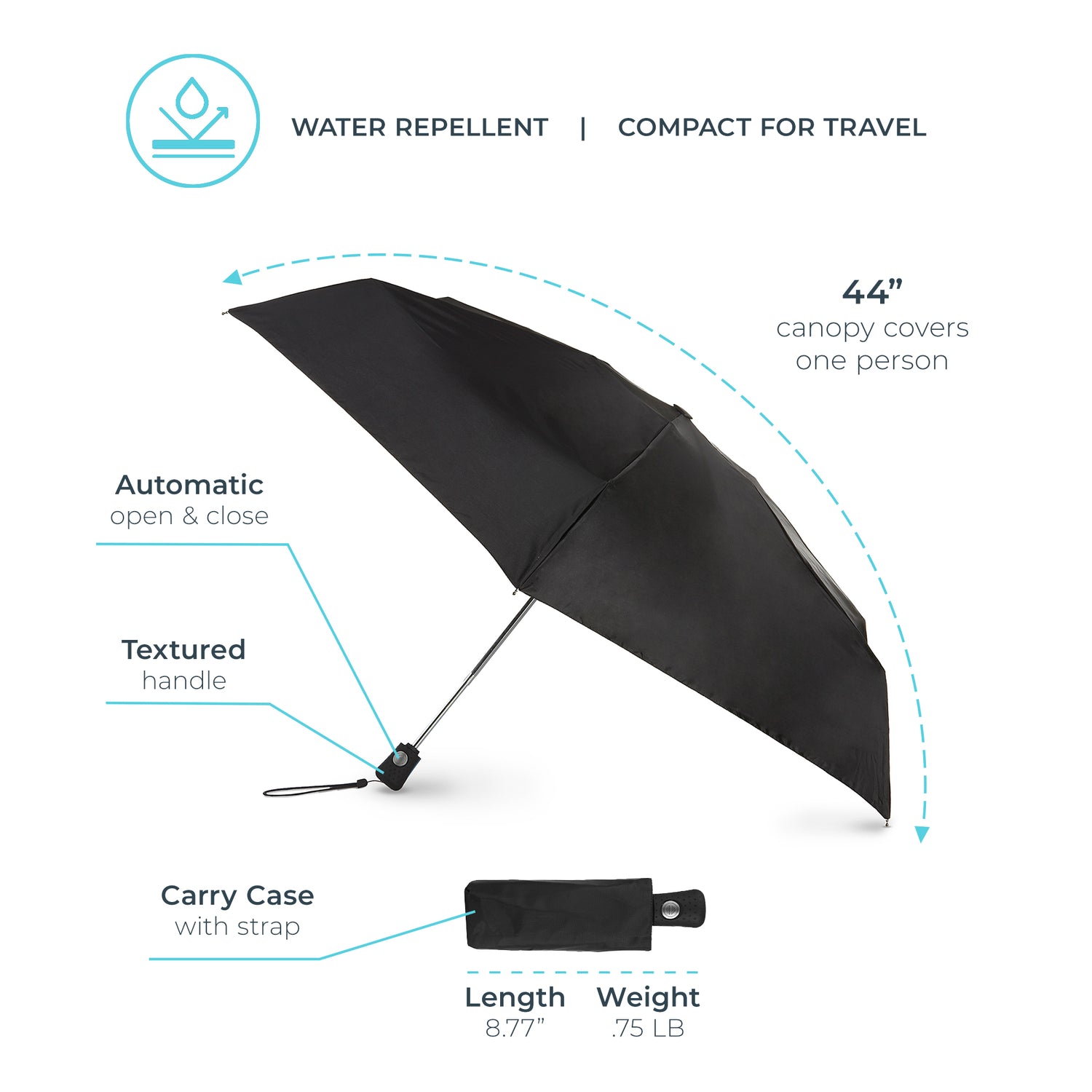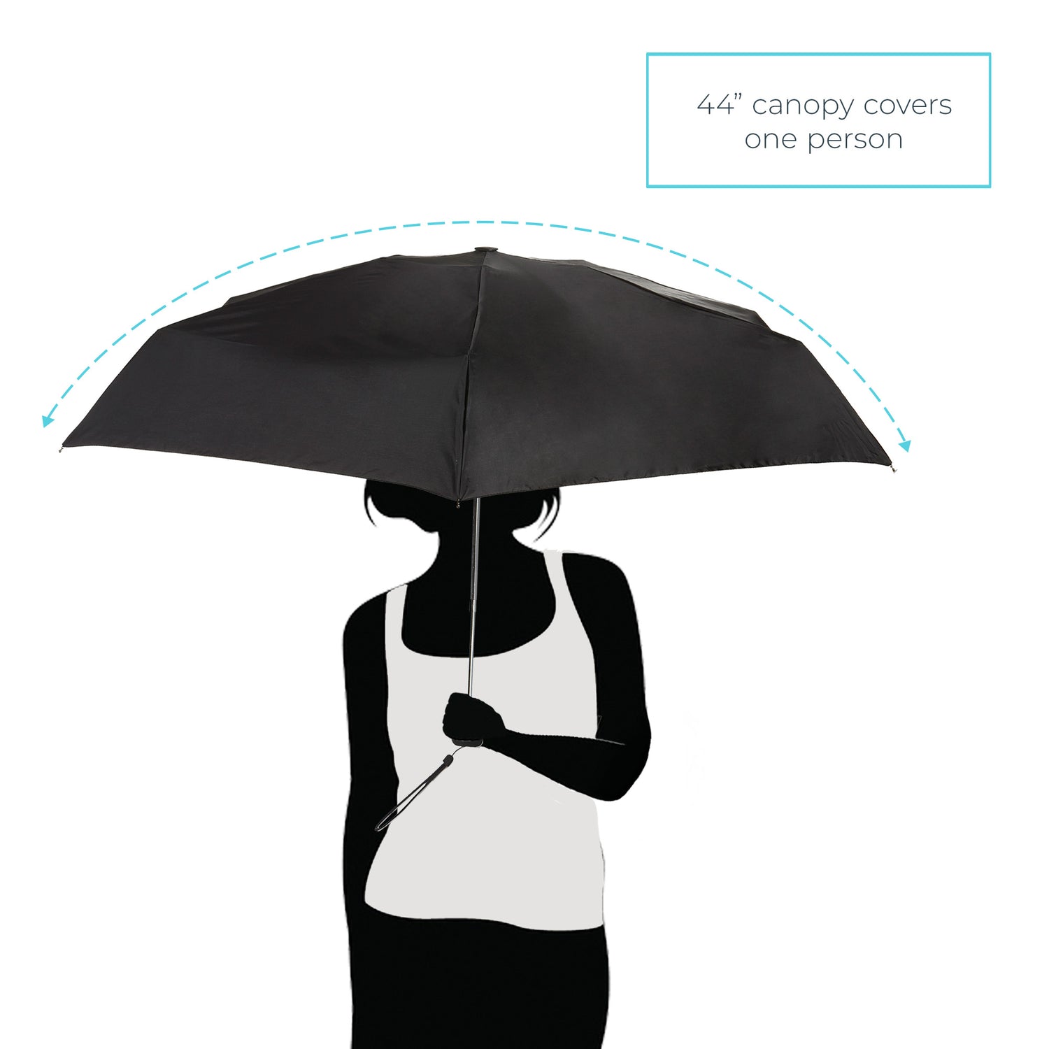 It folds down to a remarkably small size—perfect for slipping into your purse or backpack—yet opens to a generous 44" canopy at the touch of a button, thanks to smooth auto open/close technology.