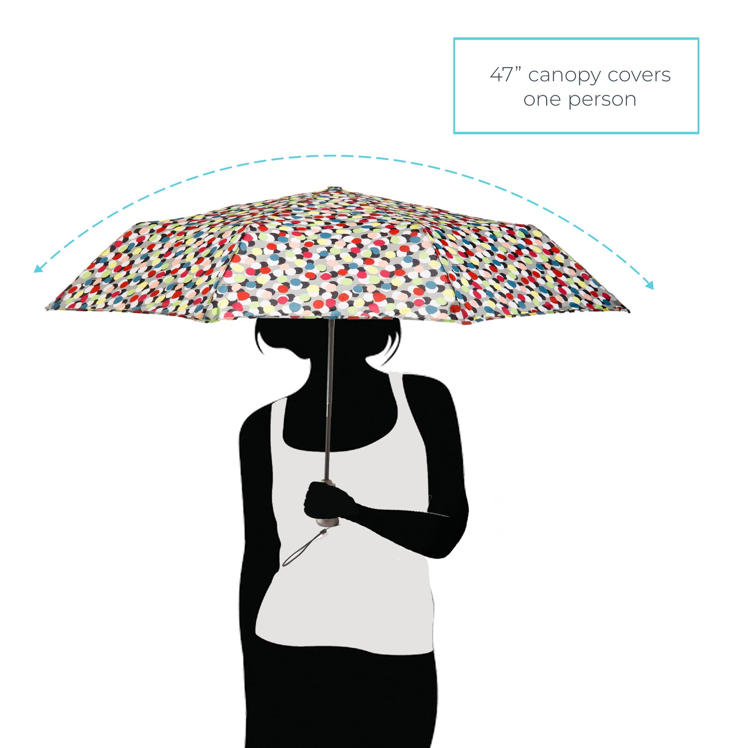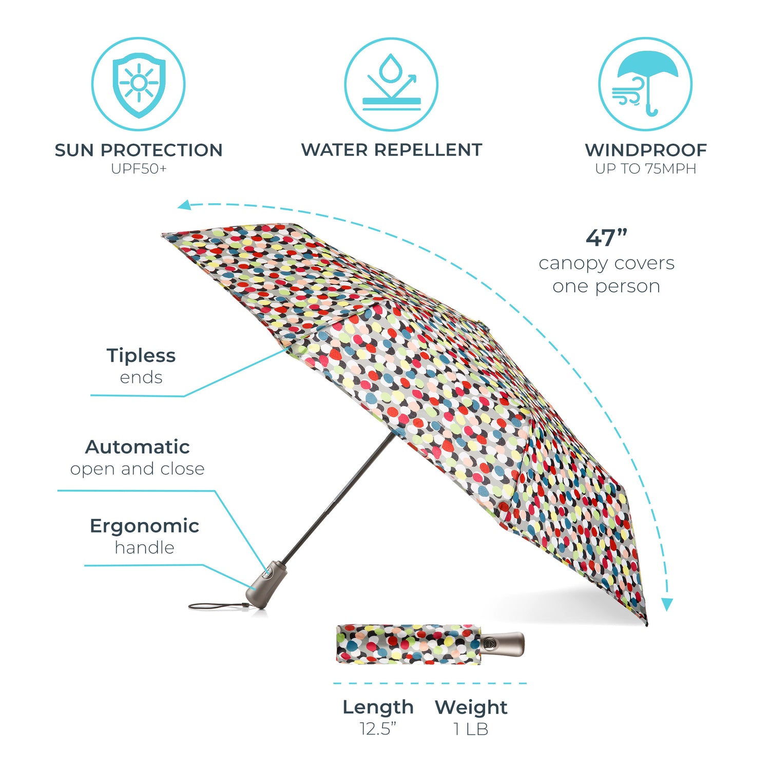 This premium compact umbrella features a generous 47” canopy and a windproof frame built to withstand gusts up to 75 MPH.